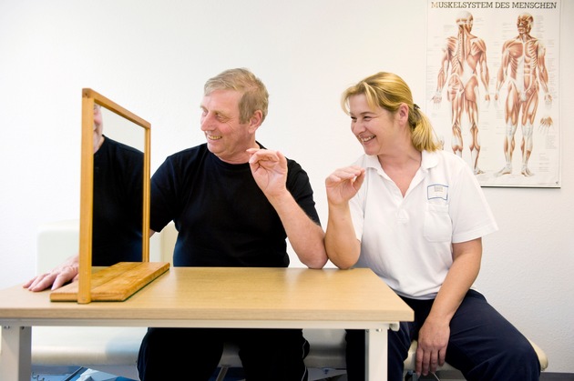 Dabei wird der Körper des Betroffenen in der Mitte gespiegelt, die betroffene Seite sieht er nicht. Mit der gesunden Hand macht er Greif- und Bewegungsübungen. Der Blick in den Spiegel täuscht das Gehirn und vermittelt den Eindruck, als bewege sich der betroffene Arm. Diese simple Illusion zeigt eine verblüffende Wirkung, wie türkische Ärzte jetzt in einer Studie eindrucksvoll belegten. Eine Gruppe von 30 Schlaganfall-Patienten wurde unterteilt. Die Hälfte erhielt eine intensive konventionelle Rehabilitation, die andere Hälfte zusätzlich 30 Minuten Spiegeltherapie pro Tag. Beide Gruppen erzielten innerhalb von vier Wochen große Fortschritte, doch in der Gruppe mit Spiegeltherapie waren die funktionellen Verbesserungen deutlich größer. Zusätzlich empfanden diese Patienten auch weniger Schmerzen.