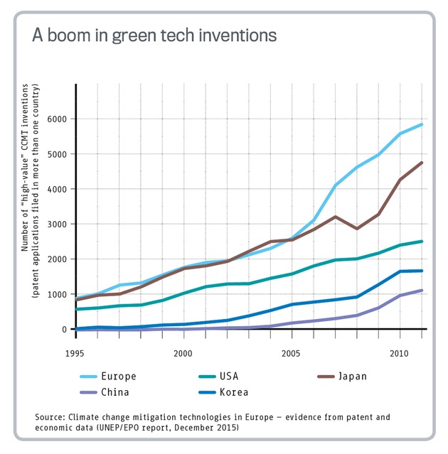Die Anzahl von Erfindungen im Bereich Klimaschutztechnologien hat sich weltweit zwischen 1995 und 2011 von 11 000 auf 51 000 nahezu verfünffacht. Bezogen auf Europa stammen die meisten Erfindungen nachhaltiger Technologien aus Deutschland: Die Bundesrepublik vereint knapp die Hälfte aller europäischen Innovationen auf sich. Auch in Relation zum Bruttoinlandsprodukt steht Deutschland bei Erfindungen von Klimaschutztechnologien an Europas Spitze vor Schweden, Frankreich und Finnland. Dies sind zentrale Ergebnisse einer gemeinsamen Studie des Europäischen Patentamts (EPA) und dem Umweltprogramm der Vereinten Nationen (UNEP), die heute im "Sustainable Innovation Forum 2015" im Rahmen der UN-Klimakonferenz in Paris vorgestellt worden ist.