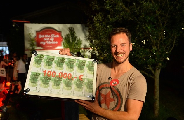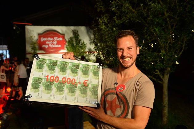 So sehen Sieger aus: Account-Manager Oliver aus Kaarst (NRW) macht das Rennen in der ProSieben-Show "Get the F*ck out of my House" und gewinnt 100.000 Euro! Der 32-Jährige harrte gemeinsam mit anfangs 99 Mitkandidaten vier Wochen lang in einem Einfamilienhaus in der Eifel auf 116 Quadratmeter aus. Oliver verließ das Haus als Letzter - und freut sich riesig über seinen Sieg: "Das ist der Wahnsinn, ich kann es nicht glauben!" Das Finale von "Get the F*ck out of my House" erreichte gestern Abend 9,2 Prozent Marktanteil bei den 14- bis 49-jährigen Zuschauern auf ProSieben.