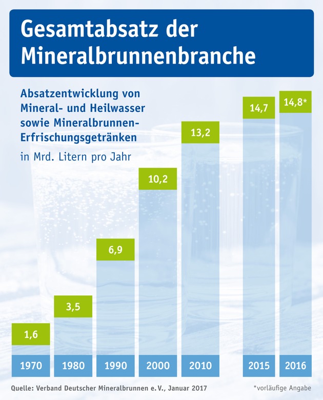 Die deutschen Mineralbrunnen haben im Jahr 2016 so viel Mineral- und Heilwasser wie nie zuvor abgefüllt. Der Rekordwert von 11,3 Milliarden Litern resultiert aus einem Zuwachs von 0,8 Prozent im Vergleich zu 2015. Der Gesamtabsatz der Branche, der sich aus Mineralwasser, Heilwasser sowie Mineralbrunnen-Erfrischungsgetränken berechnet, stieg um 0,4 Prozent auf 14,8 Milliarden Liter. Größter Gewinner unter den Mineralwasser-Sorten mit einem Plus von fast zehn Prozent war erneut Mineralwasser ohne Kohlensäure. Die Zahlen beruhen auf einer Hochrechnung, die der Verband Deutscher Mineralbrunnen e.V. (VDM) jetzt veröffentlicht hat.
