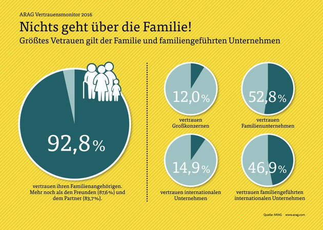 Wie schon in 2010 zeigt auch der aktuelle ARAG Vertrauensmonitor: Nichts geht über Familie - und zwar sowohl im persönlichen als auch im Unternehmensbereich. Das Düsseldorfer Familienunternehmen befragte gemeinsam mit dem Meinungsforschungsinstitut TNS Infratest mehr als 1.000 Deutsche zum Thema Vertrauen.