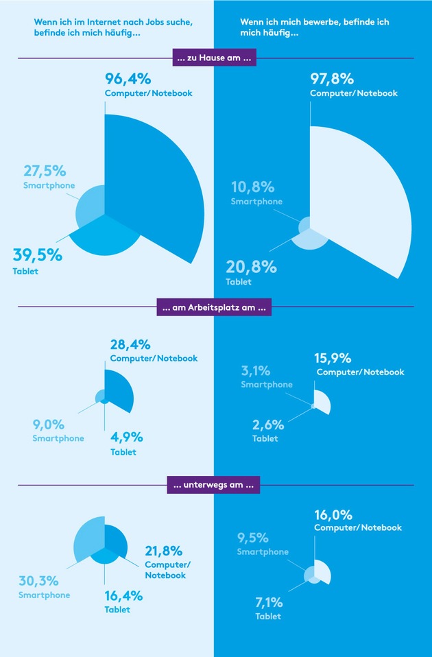 gewinnen an BedeutungRecruiting zukünftig per Smartwatch? "Ganz so weit ist die HR-Branche noch nicht", betont Studienleiter Prof. Dr. Tim Weitzel vom Lehrstuhl für Wirtschaftsinformatik, insbesondere Informationssysteme in Dienstleistungsbereichen der Universität Bamberg, "aber die Bedeutung neuer technischer Entwicklungen hinterlässt deutlich messbare Spuren im Markt." Vernetzt zu jeder Zeit und überall: 55,6 Millionen Deutsche ab 14 Jahren sind online, über die Hälfte surft auch mit Smartphone oder Tablet.* Das hat Auswirkungen auf die Jobsuche. Unternehmen haben das Potenzial und die Notwendigkeit für die mobile Optimierung ihrer Recruiting-Aktivitäten zwar erkannt, kämpfen aber in der Umsetzung darum, mit den Entwicklungen Schritt zu halten. Da sind die Arbeitnehmer schon weiter und gehen zunehmend per Handy und App auf die Suche nach dem nächsten Job. In Sachen Social Media zeigt sich eine Verstetigung der Trends - aufgrund der mittlerweile langjährigen Erfahrung mit den Kanälen und dem Aufbau sinnvoller Services für die Nutzung.