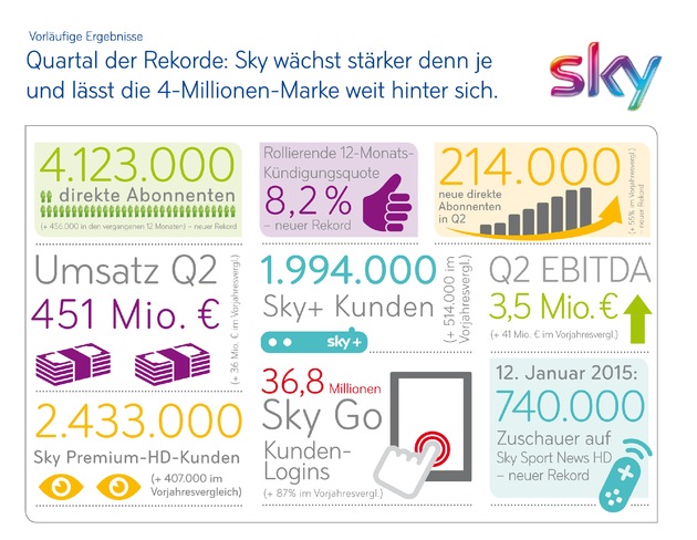 Unterföhring, 4. Februar 2015 - Im zweiten Quartal des Geschäftsjahrs 2014/15 hat Sky Deutschland neue Rekordwerte beim Kundenwachstum erzielt. Die Zahl der direkten Abonnenten stieg um 214.000 (Q2 2013/14: 138.000) und überschritt mit insgesamt 4.123.000 (Q2 2013/14: 3.667.000) erstmals die Grenze von vier Millionen. Das Bruttokundenwachstum belief sich mit 284.000 (Q2 2013/14: 244.000) ebenfalls auf Rekordniveau und belegte damit die wachsende Nachfrage nach den Services und Produkten von Sky sowie die starke Markenpräsenz. Zusammen mit der wachsenden Anzahl von Zweijahres-Verträgen, die 79% der Neuabonnements im zweiten Quartal 2014/15 ausmachten, verbesserte sich auch die Kundentreue deutlich: Die rollierende 12-Monats-Kündigungsquote lag mit 8,2% (Q2 2013/14: 11,2%) auf dem niedrigsten Niveau der Unternehmensgeschichte.
