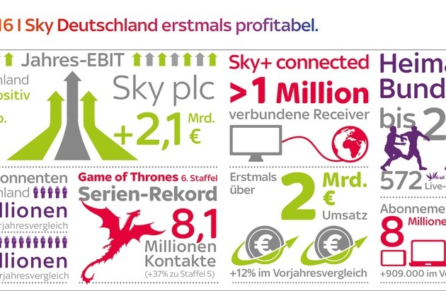 Unterföhring, 28. Juli 2016 - Sky Deutschland beendet das Geschäftsjahr 2015/16 mit neuen Rekorden. Im 4. Quartal hat das Unternehmen mit einem EBIT in Höhe von 50 Millionen Euro das beste Quartalsergebnis seit Einführung der Marke Sky erzielt. Erstmals in der Geschichte von Sky Deutschland konnte mit 5 Millionen Euro auch ein auf Gesamtjahresbasis positives EBIT ausgewiesen werden. Der Umsatz stieg um 12 Prozent auf über 2 Milliarden Euro (2,02 Mrd. Euro). Der Umsatz der Vermarktungstochter Sky Media wuchs um 19 Prozent auf den neuen Bestwert von 69 Millionen Euro.