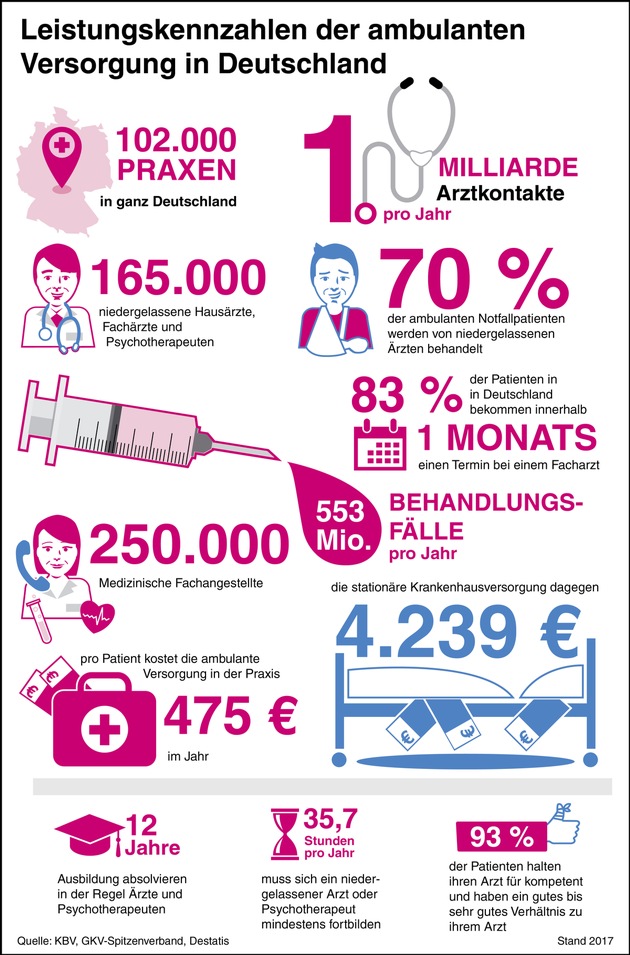 165.000 niedergelassene Hausärzte, Fachärzte und Psychotherapeuten sowie 250.000 medizinische Fachangestellte arbeiten in den 102.000 deutschen Arztpraxen und versorgen pro Jahr 553 Millionen Behandlungsfälle. Die Niedergelassenen haben in der Regel eine zwölfjährige Ausbildung durchlaufen und lernen auch im Berufsalltag immer weiter: mindestens 35,7 Stunden pro Jahr müssen sie sich fortbilden. Pro Patient kostet die ambulante Versorgung in der Praxis 475 Euro im Jahr - die stationäre Krankenhausversorgung hingegen kostet pro Patient 4.239 Euro jährlich.