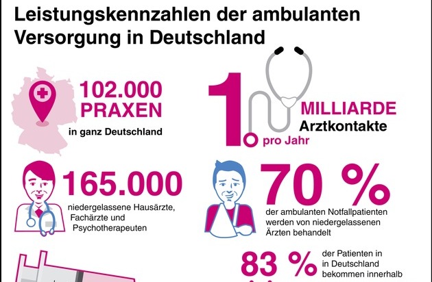 Eine Milliarde Arztkontakte in 102.000 Praxen gibt es in Deutschland jährlich - zum heutigen Start der "Woche der ambulanten Versorgung" präsentiert die Kassenärztliche Bundesvereinigung (KBV) ihre neue Infografik "Leistungskennzahlen der ambulanten Versorgung in Deutschland". Diese gibt auf einen Blick Antworten auf Fragen wie: Wie viele niedergelassene Ärzte und Psychotherapeuten gibt es hier eigentlich? Wie lange hat deren Ausbildung gedauert?