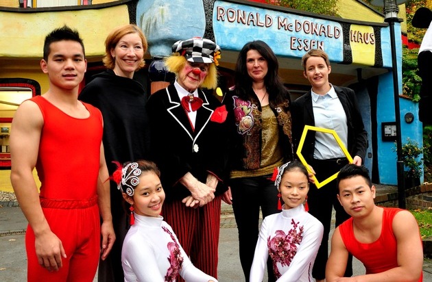 Oleg Popov besuchte heute zusammen mit Akrobaten des Chinesischen Staatscircus die Eltern und Kinder im Ronald McDonald Hundertwasser Haus Essen. Dort zauberte er nicht nur ein Lächeln auf die Gesichter der Besucher, sondern kündigte auch eine Benefizvorstellung zugunsten der McDonald's Kinderhilfe Stiftung am 23. Dezember in Essen an. Der weltberühmte Clown Oleg Popov bringt Menschen nicht nur zum Lachen, sondern hilft auch denjenigen, die gerade eine schwere Zeit durchleben. Zusammen mit dem Weltcircus-Festival richtet Oleg Popov einen Tag vor Heiligabend in Essen eine Benefizvorstellung zugunsten der McDonald's Kinderhilfe Stiftung aus. Heute besuchte er zusammen mit seiner Frau Gabi Popov, Li Dewei, dem Direktor des Chinesischen Staatscircus sowie Akrobaten des Chinesischen Staatscircus die Kinder und Familien im Ronald McDonald Hundertwasser Haus Essen.