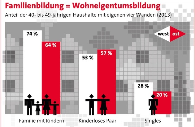 Ein Ergebnis ist der Untersuchung zufolge, dass Familien mit Kindern in der maßgeblichen Altersgruppe heute noch häufiger als früher im Wohneigentum leben. In den alten Bundesländern stieg hier die Wohneigentumsquote von 70 auf 74 Prozent. Im Osten hat sich der Anteil Familien, die in den eigenen vier Wänden wohnen, in der Altersgruppe der 40- bis 49-Jährigen sogar mehr als verdoppelt, nämlich von 30 auf 64 Prozent. Auch bei den Singles geht der Trend klar zum Wohneigentum, wenn auch auf deutlich niedrigerem Niveau. Und auch hier weist der Osten die größte Dynamik auf: Während die Eigentumsquote bei den Westdeutschen seit 1993 immerhin um 3 Prozentpunkte auf 28 Prozent gestiegen ist, hat sie sich im Osten mit einem Anteil von 20 Prozent glatt verfünffacht. Bei kinderlosen Paaren im Alter zwischen 40 und 49 Jahren liegt die Wohneigentumsquote in Ost und West ebenfalls auf relativ hohem Niveau: In den neuen Ländern erreicht sie 57 Prozent, im Westen 53 Prozent. Bei den Alleinerziehenden liegt die Wohneigentumsquote in Ost und West bei rund einem Viertel.