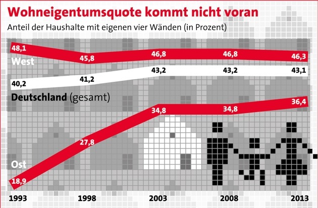 Demnach hat sich die Wohneigentumsquote seit 2003 (http://ots.de/bk6rH) lediglich in Ostdeutschland nochmals leicht verbessert, von 34,8 auf 36,4 Prozent. Im früheren Bundesgebiet hingegen ging der Anteil der Selbstnutzer sogar leicht zurück (von 46,8 auf 46,3 Prozent), so dass für Gesamtdeutschland eine Stagnation bei rund 43 Prozent resultiert (siehe Grafik). Dabei zeigt sich, dass hinter dem Stillstand bisher kaum beachtete Alters-Effekte stehen: So wird die - ohnehin relativ niedrige - Wohneigentumsquote mehr und mehr getragen von inzwischen älteren Haushalten; bei den jüngeren hingegen ist die Wohneigentumsbildung im Vergleich zu früheren Jahren rückläufig.