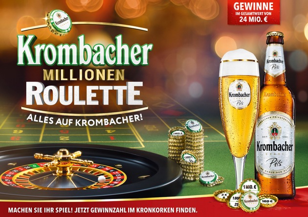 - Das gibt's nur bei Krombacher! - Gewinne im Gesamtwert von 24 Mio. Euro - Roulette-Krimi im TV - 5 große Roulette-Ziehungen - Einfach Gewinnzahl im Kronkorken finden, mitfiebern und abräumen