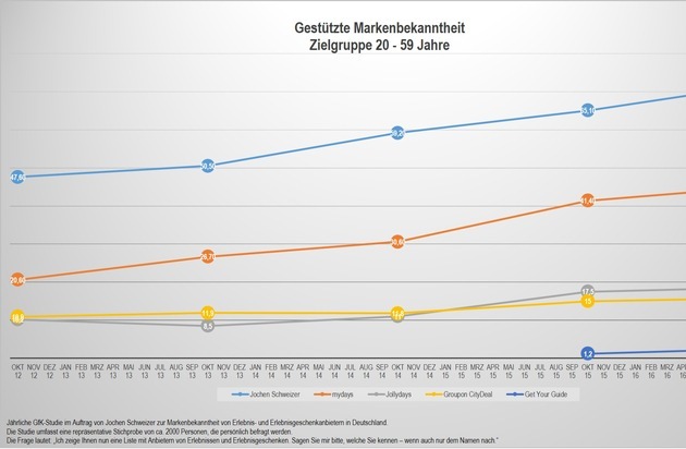 Denn die Marke Jochen Schweizer steht für das Erlebnis an sich und nicht nur für Geschenk-Gutscheine. Schon jetzt sind hunderttausende Erlebnistermine online in Realzeit buchbar und somit beantwortet Jochen Schweizer nicht nur die Frage "Was schenke ich?", sondern auch die Frage "Was wollen wir morgen unternehmen?". Die Marke ist damit auf den Buchungsoberflächen jochen-schweizer.de und der Jochen Schweizer App ein Ort der Inspiration für alle Menschen, die selbst etwas erleben wollen.
