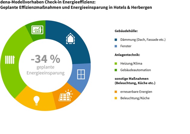 Die 31 teilnehmenden Hotels und Herbergen planen insgesamt Energieeinsparungen von rund 34 Prozent (Wärme und Strom). Dabei ist die Bandbreite erheblich: Sie reicht von Maßnahmen mit einer zehnprozentigen Einsparung bis hin zur Planung eines Plusenergiehotels.
