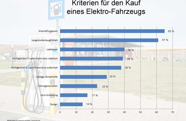 Die GfK-Erhebung gibt auch Einblick in weitere Faktoren, die neben dem Anschaffungspreis und der Langstreckentauglichkeit eines Fahrzeugs für den Kauf eines Elektro-Autos wesentlich sind: Dazu zählt die Verfügbarkeit von E-Ladestationen außerhalb von Ballungsgebieten (38%), z. B. entlang der Autobahn, sowie in städtischen Gebieten (39%). Ein wichtiges Entscheidungskriterium ist auch die Ladedauer bei Strom-Tankstopps auf Langstrecken sowie zu Hause (je 40%). Zu weiteren Aspekten der Kaufentscheidung zählen Umweltentlastung durch weniger Schadstoffe (29%). Faktoren wie Fahreigenschaften (23%) oder Design (14%) eines E-Autos fallen weniger ins Gewicht.