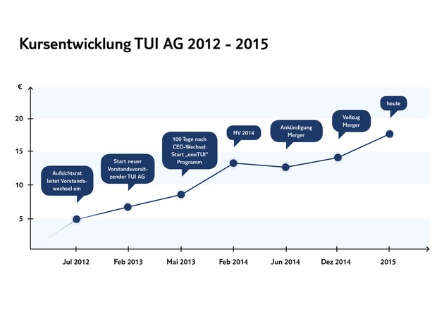 Der Kurs der TUI-Aktie schloss am 6. Mai 2015 bei 16,16 Euro. Seit der Entscheidung des Aufsichtsrates zum Vorstandswechsel Ende Juli 2012 hat sich der Kurs von 5,15 Euro um über 210 Prozent gesteigert. Die Börsenkapitalisierung der TUI Group beträgt heute rund 9,5 Milliarden Euro.