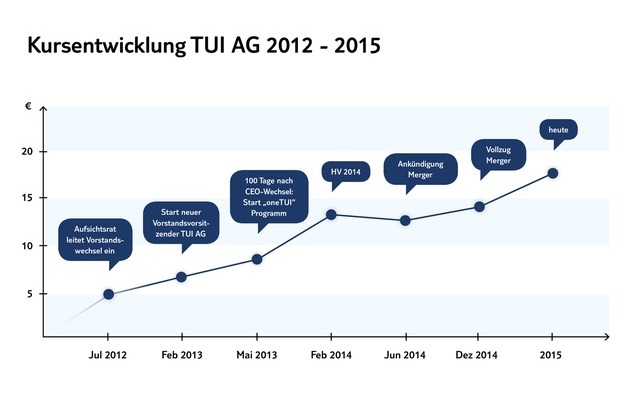 Der Kurs der TUI-Aktie schloss am 6. Mai 2015 bei 16,16 Euro. Seit der Entscheidung des Aufsichtsrates zum Vorstandswechsel Ende Juli 2012 hat sich der Kurs von 5,15 Euro um über 210 Prozent gesteigert. Die Börsenkapitalisierung der TUI Group beträgt heute rund 9,5 Milliarden Euro.