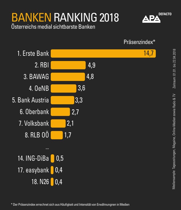 Das APA-DeFacto Banken-Ranking hat die mediale Sichtbarkeit von mehr als 80 Bankhäusern in den ersten vier Monaten des Jahres 2018 analysiert. Ausgewertet wurden dafür Tageszeitungen und Magazine, Online-Medien sowie Radio & TV.