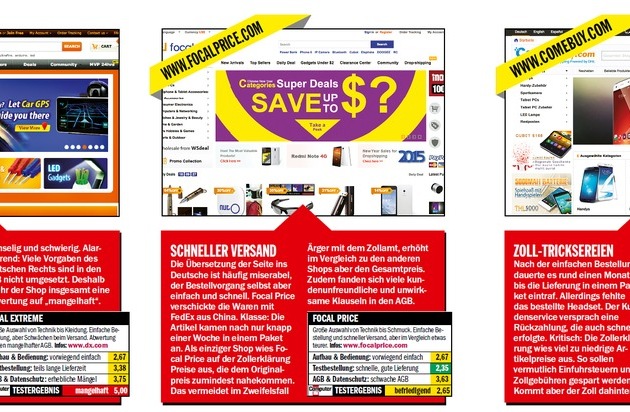 Sind Technik-Importe aus Online-Shops in Fernost eine gute Alternative zur Bestellung über Amazon und Co.? COMPUTER BILD wollte es wissen und unterzog in der aktuellen Ausgabe 12/2015 (EVT: 23. Mai 2015) drei populäre chinesische Shopping-Websites (Comebuy.com, Focalprice.com und DX.com) einem Verbrauchertest. Die Redakteure kauften je ein Smartphone, eine Smartwatch, eine Action-Cam und ein In-Ear-Headset bei den Billig-Anbietern, die mit kostenlosem Versand und Mini-Preisen für Spitzentechnologie locken. Das Fazit: Die China-Shops bieten zwar eine große Auswahl, aber in puncto Qualität müssen Kunden deutliche Abstriche machen. "Optisch waren die Modelle kaum vom jeweiligen Original zu unterscheiden. Aber die schlechtere Qualität und Ausstattung machen sich bereits nach kurzer Nutzung bemerkbar", sagt COMPUTER BILD-Redakteur Jan Bruns. Allerdings sei die gelieferte Qualität für den niedrig angesetzten Preis akzeptabel.