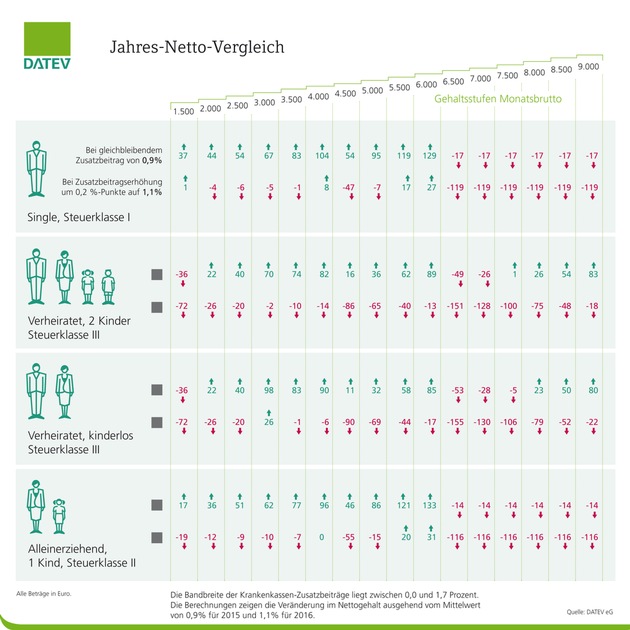 Inwiefern sich die neuen Regelungen auf das Einkommen auswirken, hat die DATEV für verschiedene Gehaltsstufen in den Konstellationen Single (Steuerklasse I), verheiratet (Steuerklasse III), verheiratet mit zwei Kindern (Steuerklasse III) und allein erziehend mit einem Kind (Steuerklasse II) berechnet. Unter dem Strich zahlen bei einer Erhöhung des Zusatzbeitrags von 0,2 Prozent fast alle Arbeitnehmer drauf. Die Maximalbelastung trifft kinderlose Verheiratete (Jahresminus von 155 Euro) und Verheiratete mit zwei Kindern (Jahresminus von 151 Euro) bei einem Brutto-Gehalt von 6.500 Euro. Singles in dieser Gehaltsgruppe trifft eine Mehrbelastung von 119 Euro, Alleinerziehende verbuchen ein Minus von 116 Euro.