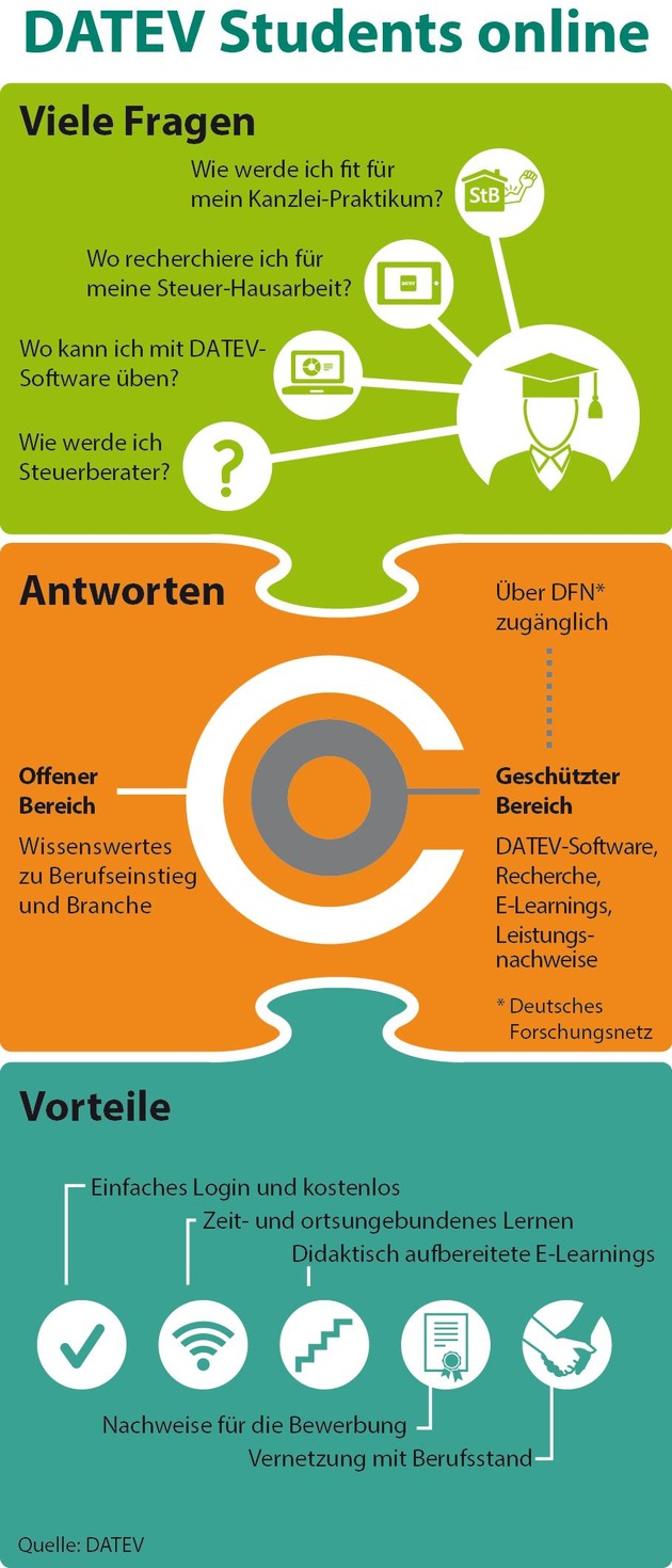Studierende insbesondere aus den Wirtschaftswissenschaften erhalten über das Portal Unterstützung bei der Berufsorientierung und Antworten auf Fragen wie: Soll ich Steuerberater werden? Wo kann ich mit Branchen-Software üben? Wo recherchiere ich für meine Steuer-Hausarbeit? Wie werde ich fit für mein Kanzlei-Praktikum? Über den didaktisch aufbereiteten Lernmedien-Mix lernen die Studierenden den Berufsstand, sein Arbeitsumfeld und die in vielen Kanzleien genutzten DATEV-Lösungen kennen.