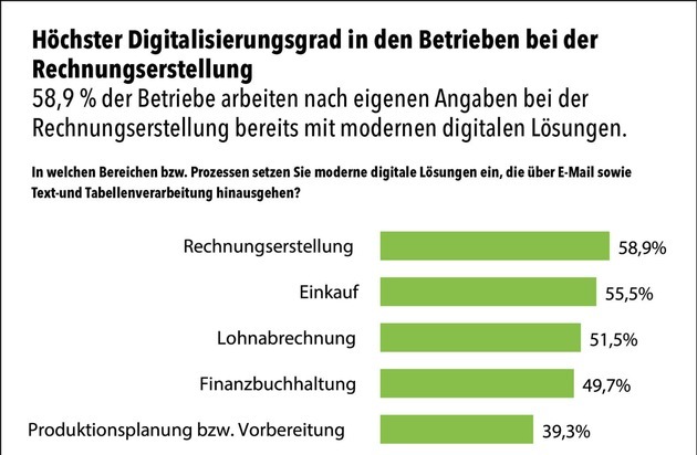 Der DATEV-Experte verwies darauf, dass laut einer Studie der Goethe-Universität in Frankfurt a.M. sich allein mit einem durchgängig digital gestalteten Prozess zur Rechnungserstellung und Rechnungsprüfung, etwa unter Einsatz des ZUGFeRD-Formates für elektronische Rechnungen, 60 bis 80 Prozent der Kosten dafür einsparen ließen. "Durch die digitale Anbindung an die Steuerberatungskanzlei erschließt sich zusätzlicher Mehrwert", so Wunram.