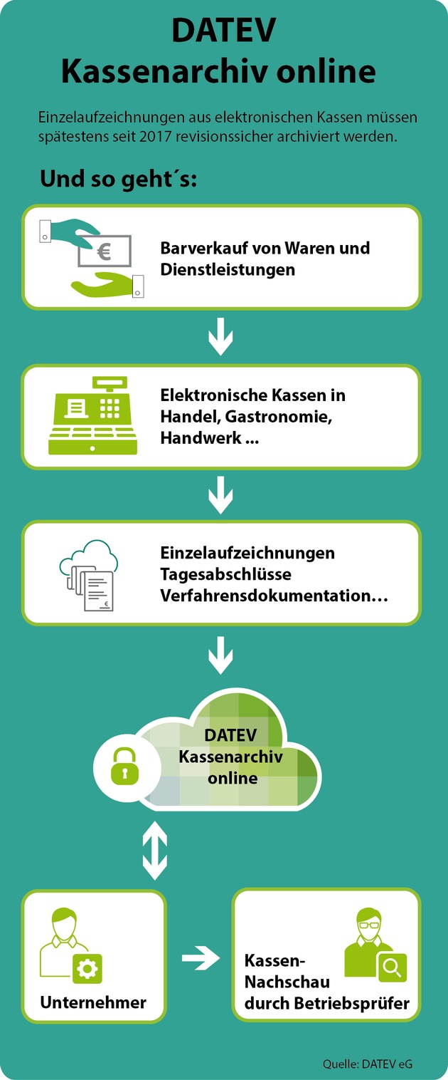 Der IT-Dienstleister DATEV eG gibt grünes Licht für die sichere Online-Archivierung von Daten aus Registrierkassen und Kassensystemen. Mit dem DATEV Kassenarchiv online können Unternehmen aus den bargeldintensiven Branchen ihre Kassendaten revisionssicher im DATEV-Rechenzentrum archivieren. Eine einfache Anmeldung im Portal www.datev.de/kassenarchiv ist dafür ausreichend.