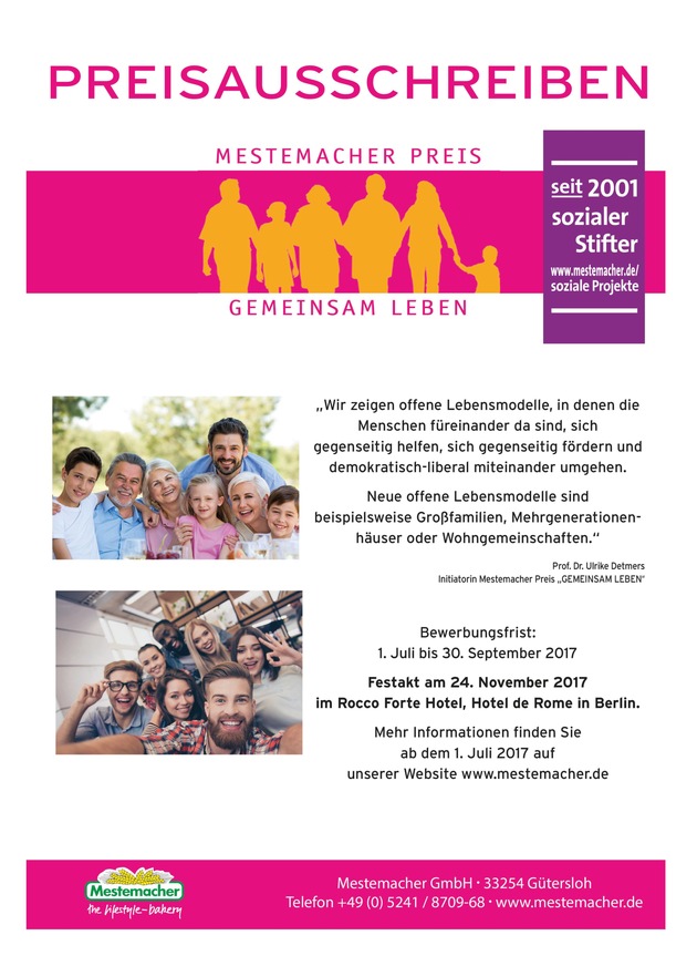 Der neue Sozialpreis der 1871 gegründeten Großbäckerei Mestemacher trägt den Titel "GEMEINSAM LEBEN". Worum geht es? Der Öffentlichkeit sollen offene Lebensmodelle, in denen die Menschen füreinander da sind, sich gegenseitig helfen, sich gegenseitig fördern und demokratisch-liberal miteinander umgehen, gezeigt werden. Neue offene Lebensmodelle sind beispielsweise Großfamilien oder Mehrgenerationenhäuser. Zu gewinnen sind 4 mal 2.500 Euro Preisgeld. Es werden also vier Gewinnerinnen und/oder Gewinner ausgezeichnet. Die Bewerbungsfrist läuft bis zum 30. September 2017.