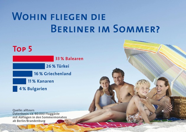 Untersuchungsmethodik: alltours hat rund 60.000 Buchungen für die Untersuchung ausgewertet. Dabei handelt es sich um Urlaubsflugreisen, die bis Anfang Juli gebucht wurden und die in den Sommermonaten, also in den Hauptferienzeiten, angetreten werden. Bei der Untersuchung wurden die beiden Berliner Flughäfen Schönefeld und Tegel berücksichtigt, von denen alltours Gäste in den Urlaub fliegen.