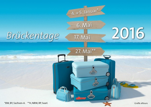 "Über diese Urlaubsbrücken kannst Du gehen". 2016 winken Arbeitnehmern mit minimalem Einsatz ein Maximum an Urlaub. Denn wer Feier- und Brückentage geschickt nutzt, kann so auf bis zu 47 freie Tage kommen. Hierfür sind nur 21 Urlaubstage nötig. Besonders die langen Wochenenden nutzen viele Deutsche gern für einen Kurzurlaub. Auf eine solch günstige Urlaubskonstellation wie in diesem Jahr müssen die Arbeitnehmer lange warten, denn ähnlich viele lange Wochenenden gibt es erst im Jahr 2025 wieder. Darauf weist der Reiseveranstalter alltours hin, der 2016 zahlreiche spezielle Angebote rund um die verlängerten Wochenenden und Brückentage im Programm hat.