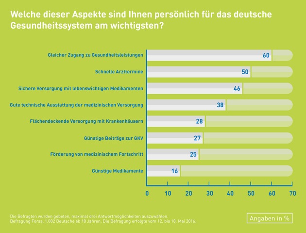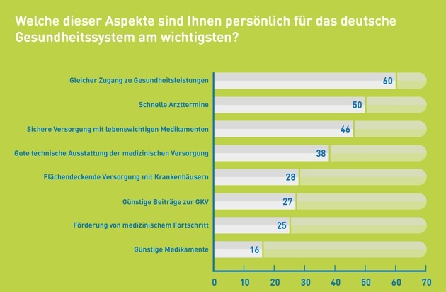 Die Deutschen wünschen sich in erster Linie eine sichere und qualitativ hochwertige Gesundheitsversorgung: Mehr als die Hälfte (60 %) findet einen gleichen Zugang zu Gesundheitsleistungen für alle Patienten am wichtigsten. Jeder Zweite (50 %) verbindet mit einem guten Gesundheitssystem vor allem schnelle Arzttermine. Ebenfalls unter den Top-3: die sichere Versorgung mit lebenswichtigen Medikamenten (46 %). Günstige Beiträge zur Krankenversicherung (27 %) und günstige Medikamente (16 %) landen dagegen auf den hinteren Plätzen.