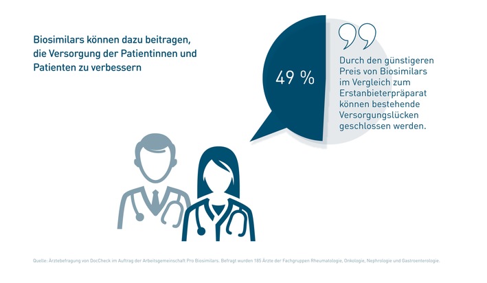Zwei Drittel der Befragten sind der Ansicht, dass Biosimilars das Gesundheitssystem entlasten werden (62 %). Doch nicht nur für die GKV, auch für Patienten sehen Ärzte einen großen Nutzen: Die Hälfte der Befragten geben an, dass Biosimilars durch ihren günstigeren Preis dazu beitragen werden, bestehende Versorgungslücken zu schließen (49 %).