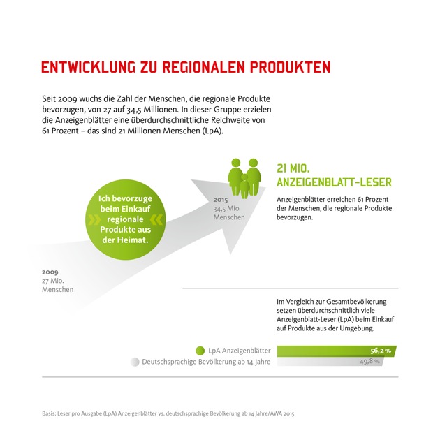 Lokale Nachrichten sowie werbliche Angebote der Händler vor Ort finden zahlreiche Verbraucher im Anzeigenblatt. In der deutschsprachigen Gesamtbevölkerung ab 14 Jahre liegt der in der AWA 2015 ermittelte Anteil des Weitesten Leserkreises (WLK) bei 80 Prozent. Das sind etwa 55,4 Millionen Menschen. Rund 54 Prozent der Bevölkerung gehören zu den Lesern pro Ausgabe (LpA) - damit erreichen Anzeigenblätter mit einer durchschnittlichen Ausgabe mehr als 37 Millionen Konsumenten. Unter den Menschen, die beim Einkauf regionale Produkte bevorzugen, erzielen Anzeigenblätter mit 61 Prozent (LpA) eine überdurchschnittliche Reichweite.