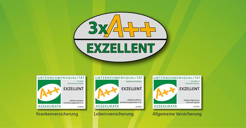 Die Ratingagentur Assekurata hat die drei großen Versicherungsunternehmen der Debeka-Gruppe erneut mit dem bestmöglichen Rating "exzellent" (A++) ausgezeichnet. Sie ist damit der einzige Versicherer, der in allen drei Ratings das Prädikat "exzellent" erzielt. Die Debeka Lebensversicherung erhält die Bestnote bereits zum 13. Mal, die Debeka Krankenversicherung zum achten Mal und die Debeka Allgemeine Versicherung, der Schaden- und Unfallversicherer der Gruppe, zum fünften Mal - und das jeweils ununterbrochen seit der ersten Teilnahme an den Ratings.