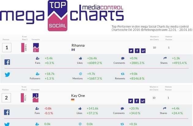 Nationaler Facebook + Twitter-Erfolg ist messbar: Rihanna und Kay One sind Top-Performer in Deutschland im Netz