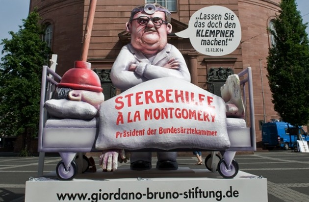 "Wir haben lange überlegt, ob man das ernste Thema Sterbehilfe in dieser satirischen Form angehen sollte, uns aber letztlich dafür entschieden, weil man nur so die Ungeheuerlichkeit verdeutlichen kann, die sich hinter Montgomerys Aussage verbirgt", erklärte der Philosoph Michael Schmidt-Salomon, der als Vorstandsprecher der Giordano-Bruno-Stiftung (gbs) für die Kunstaktion verantwortlich zeichnet. "Was Frank Ulrich Montgomery am 12. Dezember im Haus der Bundespressekonferenz sagte, zeugt nicht nur von mangelndem Mitgefühl und Respekt gegenüber den Patienten, sondern auch von fehlender Professionalität und Weitsicht. Denn wenn Ärzte, die dank ihrer Ausbildung den letzten Wunsch sterbewilliger Patienten am ehesten erfüllen können, diese Aufgabe nicht wahrnehmen dürfen, werden Menschen einspringen, die die erforderlichen Kenntnisse nicht besitzen. Was das bedeutet, zeigt 'Der Sterbe-Klempner' in plastischer Weise auf."