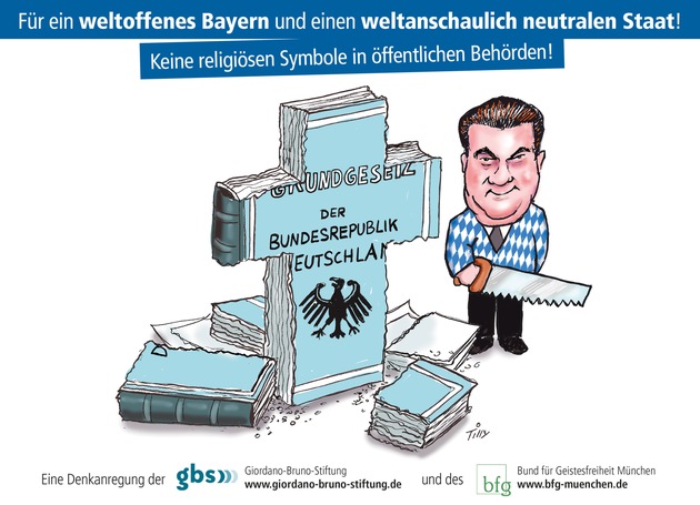 Pünktlich zum Inkrafttreten der neuen Kreuz-Verordnung in Bayern am Freitag, dem 1. Juni 2018, veranstalten die Giordano-Bruno-Stiftung (gbs) und der Bund für Geistesfreiheit (bfg) einen "Aktionstag für ein weltoffenes Bayern und einen weltanschaulich neutralen Staat". Der Düsseldorfer Künstler Jacques Tilly hat hierzu eine Karikatur von Markus Söder gezeichnet, der mit einer Säge das deutsche Grundgesetzbuch auf Kreuzform zurückgeschnitten hat. Am Wochenende wird das Söder-Plakat in München vielerorts zu sehen sein.