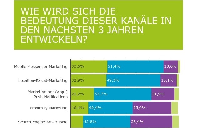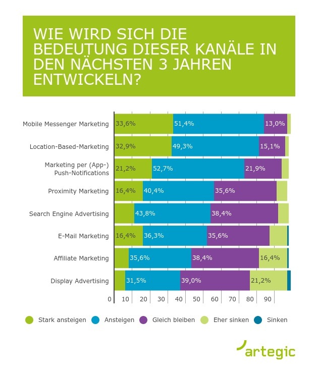 Die Unternehmen im B2B Bereich sehen in den nächsten drei Jahren vor allem einen Bedeutungszuwachs mobiler Messenger Dienste wie WhatsApp. Rund 80 Prozent sehen hier einen Anstieg oder einen starken Anstieg. Platz 2 belegt Location Based Marketing mit 49,3 Prozent der Unternehmen, die von einem Anstieg ausgehen und weiteren 33 Prozent, die von einem starken Anstieg ausgehen. Auch Marketing per (App-)Push-Notifications (74 Prozent) und Proximity Marketing (57 Prozent) zählen zu den Kanälen, deren Bedeutung stark zunehmen wird. Auch die Bedeutung des E-Mail Marketings wird weiter ansteigen, dessen sind sich 53 Prozent sicher.