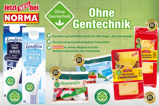 Seine abermalige Vorreiterrolle unterstreicht NORMA nicht zuletzt damit, dass erstmals der Mozzarella der NORMA-Marke Villa Gusto in der 125 g-Packung garantiert gentechnikfrei hergestellt und somit mit dem Label "Ohne Gentechnik" gekennzeichnet wird. Genau das kann jetzt auch die NORMA-Frischmilch für sich in Anspruch nehmen: Auf den 1-Liter-Packungen Landfein Frische Vollmilch (3,5 Prozent Fett) und Landfein Frische Fettarme Milch (1,5 %) finden NORMA-Kunden wieder gut sichtbar das grüne Label. Beim Engagement für gentechnikfreie Lebensmittel gehören die NORMA-Filialen zu den Schrittmachern - mit frischen Eiern in allen Regionen bereits verlässlich gentechnikfrei. NORMA unterstreicht seinen Einsatz durch die aktive Mitgliedschaft im Verband Lebensmittel ohne Gentechnik (VLOG), dem der Discounter aus Nürnberg im Sommer 2015 beigetreten ist.