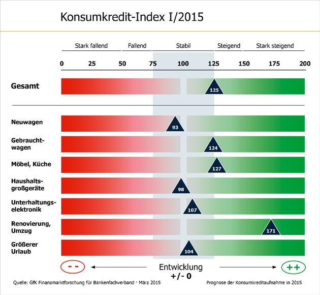 Der Konsumkredit-Index prognostiziert die Kreditaufnahme durch Verbraucher in den kommenden zwölf Monaten. Dazu befragt die GfK zweimal jährlich rund 1.500 Haushalte. Ein Indexwert von 100 beschreibt eine Entwicklung auf Vorjahresniveau, ab 125 steigt die Kreditnutzung signifikant und ab 150 stark an.