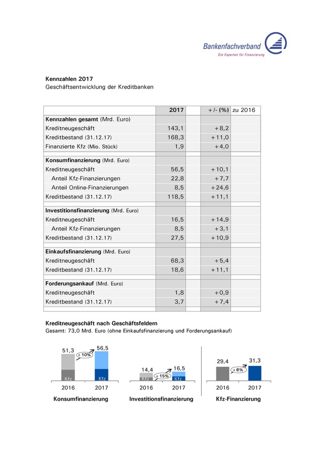 Im Jahr 2017 haben die auf die Finanzierung von Konsum- und Investitionsgütern spezialisierten Kreditbanken ihr Geschäft weiter ausgebaut. Sie vergaben neue Kredite im Wert von 56,5 Milliarden Euro an Verbraucher. Das ist ein Plus von zehn Prozent im Vergleich zum Vorjahr. Noch deutlicher weiteten die Institute ihre Kreditvergabe an Unternehmen aus. Sie stieg um 15 Prozent auf 16,5 Milliarden Euro. "Verbraucher und Unternehmen haben verstärkt in Konsum- bzw. Investitionsgüter investiert und diese finanziert", sagte Jan W. Wagner, Vorstandsvorsitzender des Bankenfachverbandes, vor Medienvertretern in Frankfurt und erläuterte: "Die historisch niedrigen Arbeitslosenzahlen wirken sich positiv auf das Konsumklima aus und die gute Konjunktur befördert die gewerblichen Ausrüstungsinvestitionen." Insgesamt finanzierten die Kreditbanken 1,9 Millionen Kraftfahrzeuge per Kredit und damit vier Prozent mehr als noch ein Jahr zuvor.
