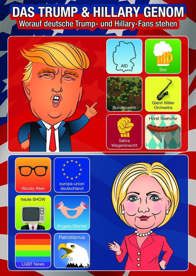 Merkel-Fans würden Hillary Clinton wählen, Seehofer-Sympathisanten eher Donald Trump. Deutsche Trump-Anhänger schwärmen für Bundeswehr und Bier und kommen aus den - politisch gesehen - eher äußeren Lagern, nämlich von der AfD oder sind Fans von Sahra Wagenknecht. Clinton-Fans hierzulande dagegen gucken die "heute SHOW", sympathisieren mit den weltoffenen LGBT News, stehen gleichzeitig auf Patriotismus und "Stadtneurotiker" Woody Allen. Das verraten die Facebook-Likes von deutschen Trump- und Clinton-Fans kurz vor der US-Präsidentschaftswahl 2016. Die Kommunikationsberatung komm.passion hat 45.000 Profile genauer unter die Lupe genommen. Die neue Methode der "Social Media Analytics" liefert verblüffende Resultate.