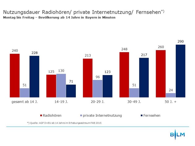 Beim Vergleich der Nutzungsdauer der klassischen Medien mit der Internetnutzung fällt auf, dass das Radio mit einer Hördauer von 240 Minuten bezogen auf die Bevölkerung ab 14 Jahren insgesamt am längsten genutzt wird. Beim Vergleich der Altersgruppen untereinander weist die Radionutzungsdauer zwar die geringsten Schwankungen auf, das Internet ist aber bei den 14- bis 19-Jährigen mit einer Nutzungsdauer von 130 Minuten vor dem Radio mit 125 Minuten bereits das am längsten genutzte Medium, während das Fernsehen in dieser Altersgruppe mit 71 Minuten nur noch den dritten Platz belegt. Bei den über 20-Jährigen dominieren nach wie vor die klassischen Medien Radio und TV.