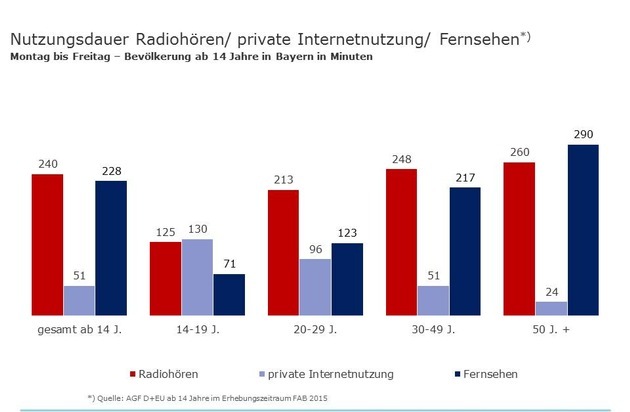 Beim Vergleich der Nutzungsdauer der klassischen Medien mit der Internetnutzung fällt auf, dass das Radio mit einer Hördauer von 240 Minuten bezogen auf die Bevölkerung ab 14 Jahren insgesamt am längsten genutzt wird. Beim Vergleich der Altersgruppen untereinander weist die Radionutzungsdauer zwar die geringsten Schwankungen auf, das Internet ist aber bei den 14- bis 19-Jährigen mit einer Nutzungsdauer von 130 Minuten vor dem Radio mit 125 Minuten bereits das am längsten genutzte Medium, während das Fernsehen in dieser Altersgruppe mit 71 Minuten nur noch den dritten Platz belegt. Bei den über 20-Jährigen dominieren nach wie vor die klassischen Medien Radio und TV.