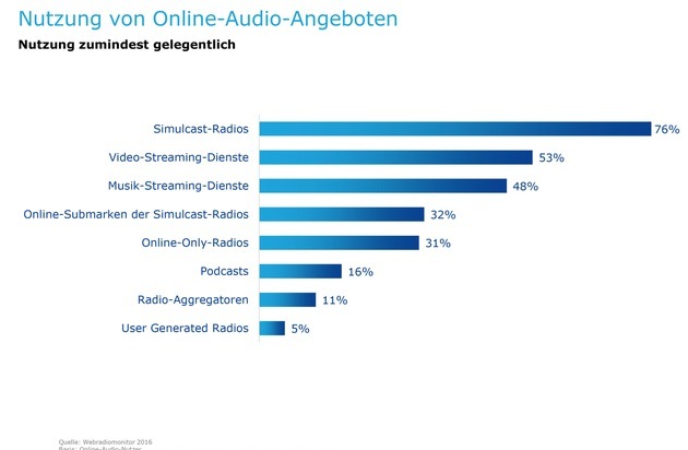 Erstmals wurden in der Erhebung für den Webradiomonitor neben Anbietern auch Nutzer befragt und in der Auswertung berücksichtigt. Demnach findet der gesamte Audio- und Musikkonsum, einschließlich Radio- und Webradio-Nutzung, bei den Online-Audio-Hörern (ab 14 Jahren) nach Einschätzung der Befragten bereits zu 48 Prozent online statt, bei den 18- bis 23-Jährigen sogar zu 60 Prozent. Besonders stark werden Live-Radio- und Musik-Streaming nachgefragt - allen voran die klassischen Radiomarken: Simulcast-Radios werden von 76 Prozent der Befragten mindestens gelegentlich genutzt, gefolgt von Video-Streaming-Diensten (53 Prozent), Musik-Streaming-Diensten (48 Prozent), Online-Submarken der Simulcast-Radios (32 Prozent), Online-Only-Radios (31 Prozent), Podcasts (16 Prozent), Radio-Aggregatoren (11 Prozent) und User-Generated Radios (5 Prozent). Im Tagesverlauf dominieren Simulcast-Radios von morgens bis mittags die Nutzung, nachmittags und am Abend sind dann Musik-Streaming-Dienste die meistgenutzten Angebote. Dabei genießt Werbung bei den Befragten insgesamt eine hohe Akzeptanz: 77 Prozent der Befragten geben der Werbefinanzierung gegenüber kostenpflichtigen Online-Audio-Angeboten den Vorzug.