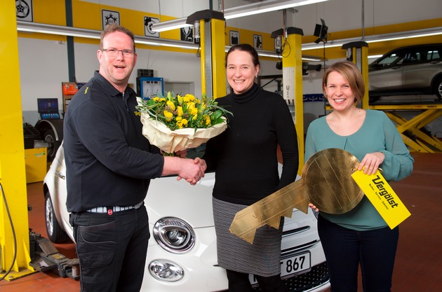 Neues Jahr - neues Auto: Der Hauptpreis des Vergölst Jubiläumsgewinnspiels - ein weißer Fiat 500 - hat seinen neuen Besitzer gefunden. Im Fachbetrieb in Lemgo (Ostwestfalen) hat die Kundin Ute R. das Fahrzeug in Empfang genommen.