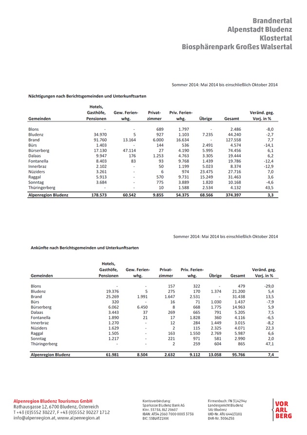 Besonders hervorzuheben ist hier die Gemeinde Bürserberg, welche sich von 74.456 (Sommersaison 2014) um 12,6% auf 83.815 Nächtigungen steigern konnte. Ein schöner Streich, nachdem der Gemeinde bereits im Sommer 2014 verglichen mit dem Sommer 2013 eine Steigerung von 6,1% gelungen war. Diese deutliche Steigerung ist auf Investitionen in die Infrastruktur und Qualität der Unterkünfte im Brandnertal zurückzuführen: mit dem Natursprünge-Weg, welcher im Juni 2014 eröffnet wurde, wurde das Familienangebot im Brandnertal mit einem hochwertigen, interaktiven Themenweg ergänzt. Darüber hinaus ging der Bikepark Brandnertal im August 2014 in Betrieb, welcher im Sommer 2015 erweitert wurde: mit mehr als 11.000 Bikern übertraf er weit die Erwartungen, welche an die erste volle Saison gestellt worden waren.