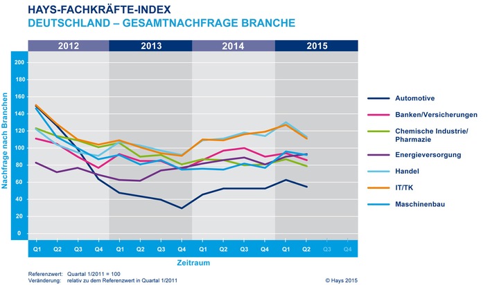 Insgesamt verlor der Hays-Fachkräfte-Index sieben Punkte und steht nun bei 98 Punkten. Den Referenzwert von 100 bildet das 1. Quartal 2011. Der Index basiert auf einer quartalsweisen Auswertung aller relevanten Stellenanzeigen in regionalen und überregionalen Tageszeitungen sowie den meistfrequentierten Online-Jobbörsen.