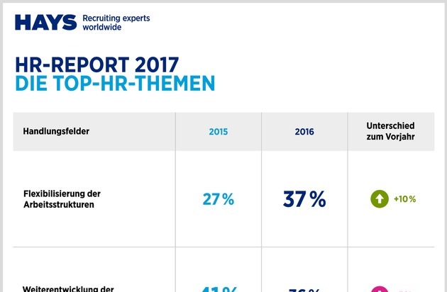Die Digitalisierung sorgt dafür, dass sich die HR-Prioritäten in Unternehmen verschieben. So hat sich die Rangfolge der wichtigsten HR-Handlungsfelder im Vergleich zum Vorjahr deutlich verändert: Im neuen HR-Report 2017 steht die Flexibilisierung der Arbeitsstrukturen auf dem ersten Platz (von 27 auf 37 Prozent).