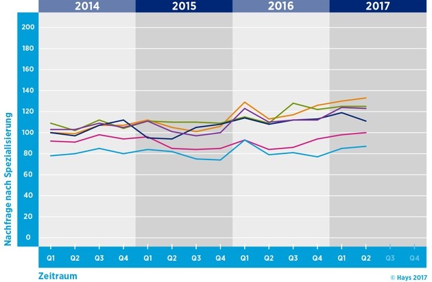 Aufgrund der guten wirtschaftlichen Großwetterlage bewegt sich die Suche nach Fachkräften weiterhin auf einem stabil hohen Niveau. So ist der Hays-Fachkräfte-Index im 2. Quartal 2017 zum vierten Mal in Folge auf nun 117 Punkte gestiegen. Im Vergleich zum Vorquartal fiel der Anstieg mit 1 Punkt jedoch moderat aus. Noch ein Quartal zuvor erhöhte sich der Index um 7 Punkte.