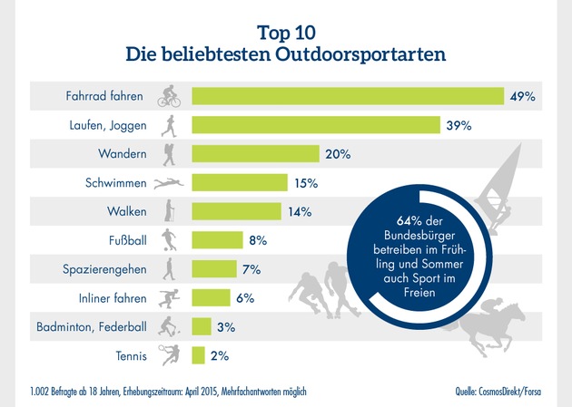 (1) Repräsentative forsa-Umfrage "Sport und Bewegung im Freien" im Auftrag von CosmosDirekt unter 1.002 Bundesbürgern ab 18 Jahren im April 2015.