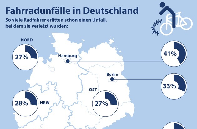 Eine Autotür, die plötzlich aufgestoßen wird, ein Hindernis auf dem Weg - schnell ist es passiert: 53 Prozent der Radfahrer in Deutschland hatten bereits einmal einen Unfall mit dem Fahrrad und 29 Prozent der Betroffenen haben sich dabei verletzt. Das ergab jetzt eine repräsentative forsa-Studie im Auftrag von CosmosDirekt.(1) In der Mitte (34 Prozent) und im Süden Deutschlands (30 Prozent) liegen die Radunfälle mit Verletzungen sogar über dem Bundesdurchschnitt. Unter Deutschlands Metropolen sticht besonders Hamburg hervor: Hier haben 41 Prozent der Fahrradfahrer bereits einen Unfall erlitten, bei dem sie sich eine Verletzung zugezogen haben.